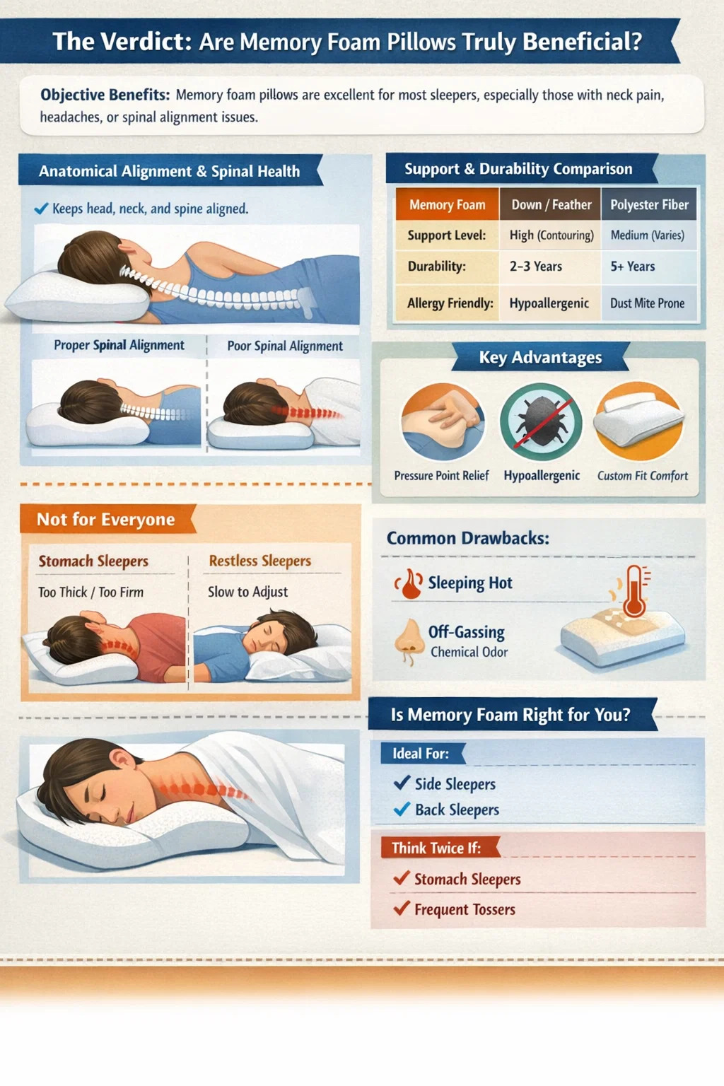 Vaikka ne tarjoavat merkittäviä ortopedisia etuja, ne eivät ole yleinen ihmelääke. Niiden "hyvyys" riippuu pitkälti henkilökohtaisesta nukkumisasennostasi, lämmönkestävyydestäsi ja herkkyydestäsi materiaalien hajuille. Sivu- tai takanukkuja varten muistivaahto -tyyny voi olla a muuntava työkalu unihygieniaan , kun taas vatsassa nukkuva voi pitää niitä liian rajoittavina tai kiinteinä.