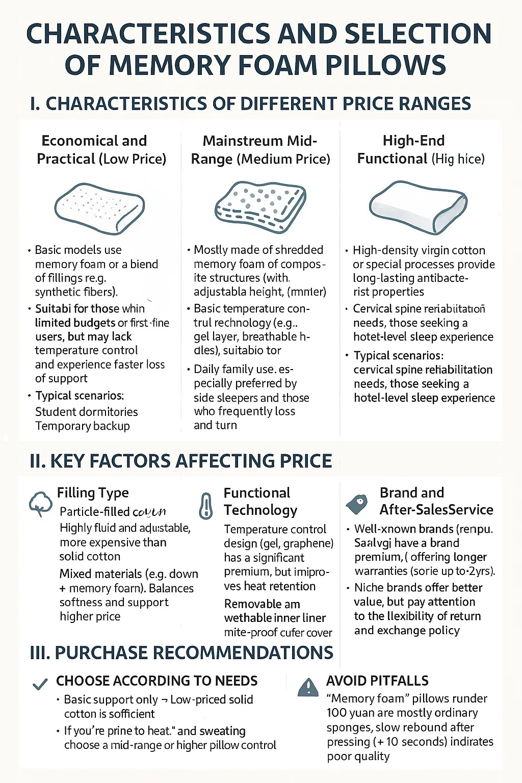 Muistivaahtomuovityynyt Hinnat vaihtelevat huomattavasti, ja niihin vaikuttavat pääasiassa materiaalit, toiminnot, tuotemerkki ja muotoilu. Alla on lyhyt kuvaus yleisistä hintaluokista ja niitä vastaavista ominaisuuksista: