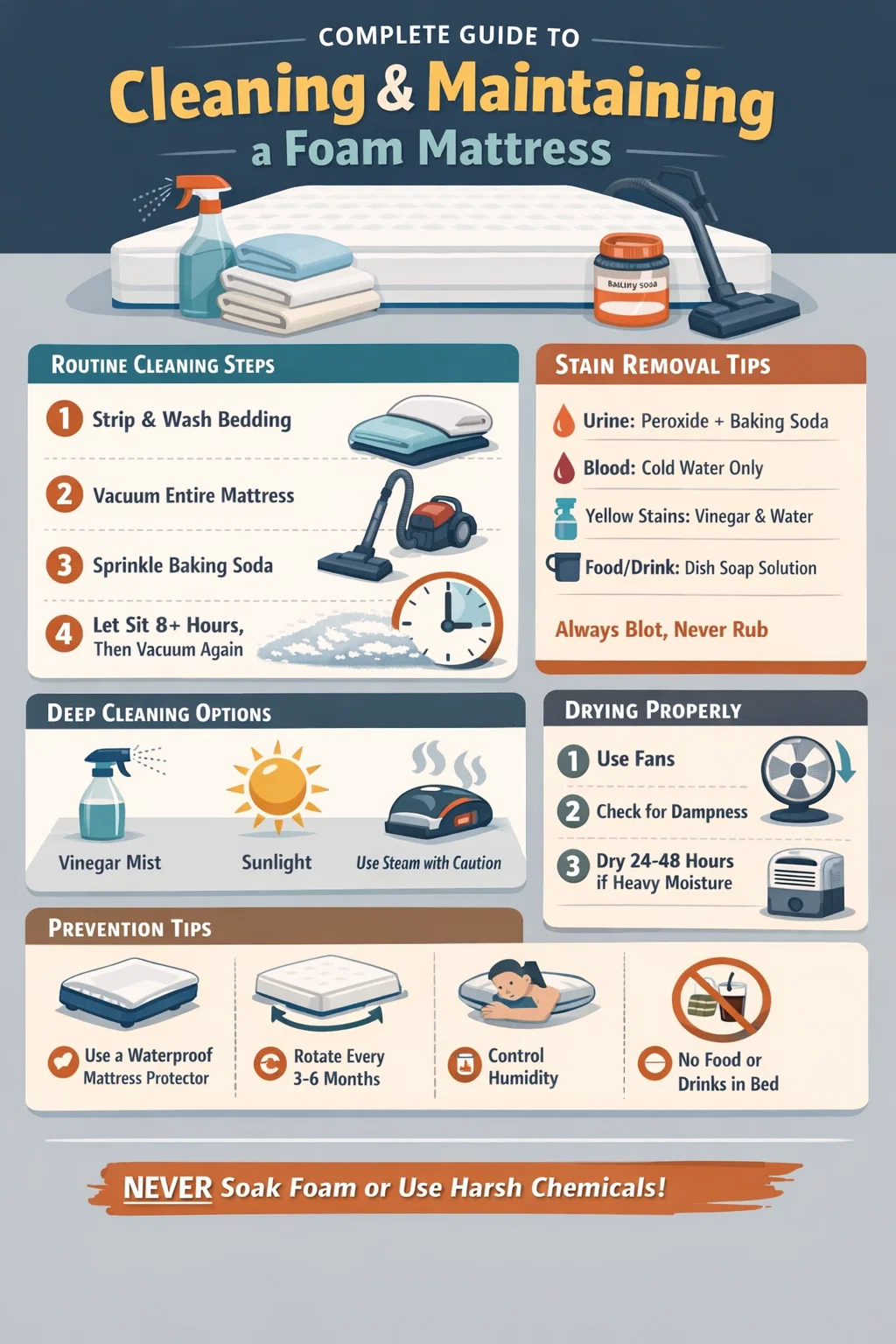 Vaahtomuovipatjan puhdistamiseksi kuori vuodevaatteet, imuroi koko pinta perusteellisesti, täplätä mahdolliset tahrat miedon astianpesuaineen ja kylmän veden seoksella, ripottele patjan päälle runsaasti ruokasoodaa, anna sen seistä vähintään 8 tuntia ja imuroi sitten uudelleen. Älä koskaan liota a memory foam patja vedellä tai laita pesukoneeseen — tämä rikkoo vaahtosolut pysyvästi ja mitätöi useimmat takuut.