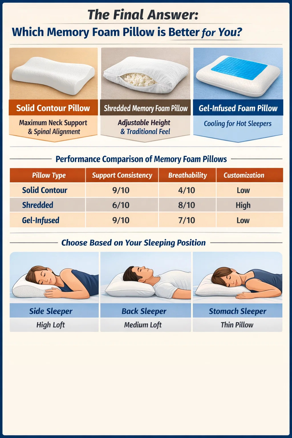 Ei ole olemassa yhtä "parasta" tyynyä, mutta on olemassa selvä voittaja, joka perustuu erityisiin nukkumistottumuksiin. Jos asetat etusijalle maksimaalisen niskatuen ja selkärangan kohdistuksen, a kiinteä muotoinen muistivaahtotyyny on ylivoimainen. Jos pidät perinteisestä tunnelmasta, jossa on mahdollisuus säätää korkeutta, a silputtu muistivaahtotyyny on parempi valinta. Niille, jotka heräävät usein hikoillen, a geelipohjainen tai avosoluinen muistivaahtotyyny on ainoa toimiva vaihtoehto ylikuumenemisen estämiseksi.
